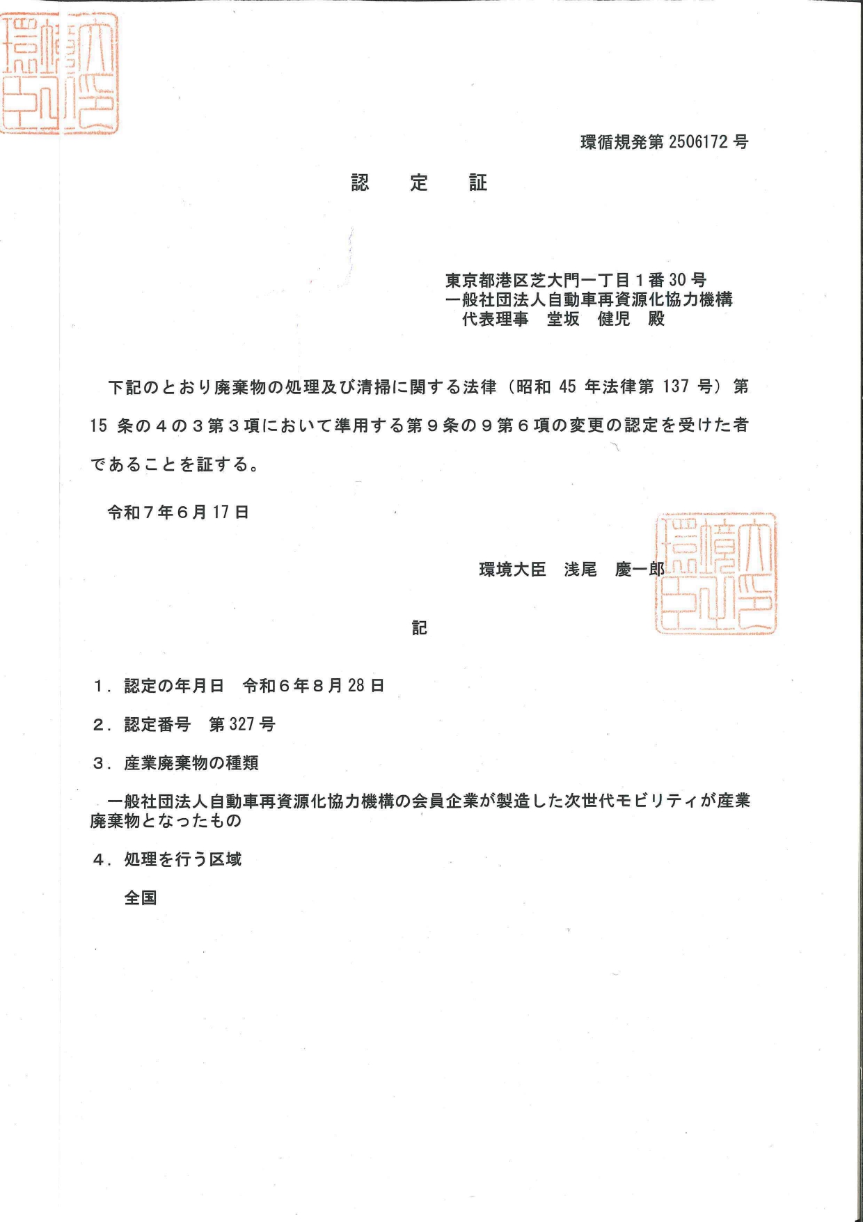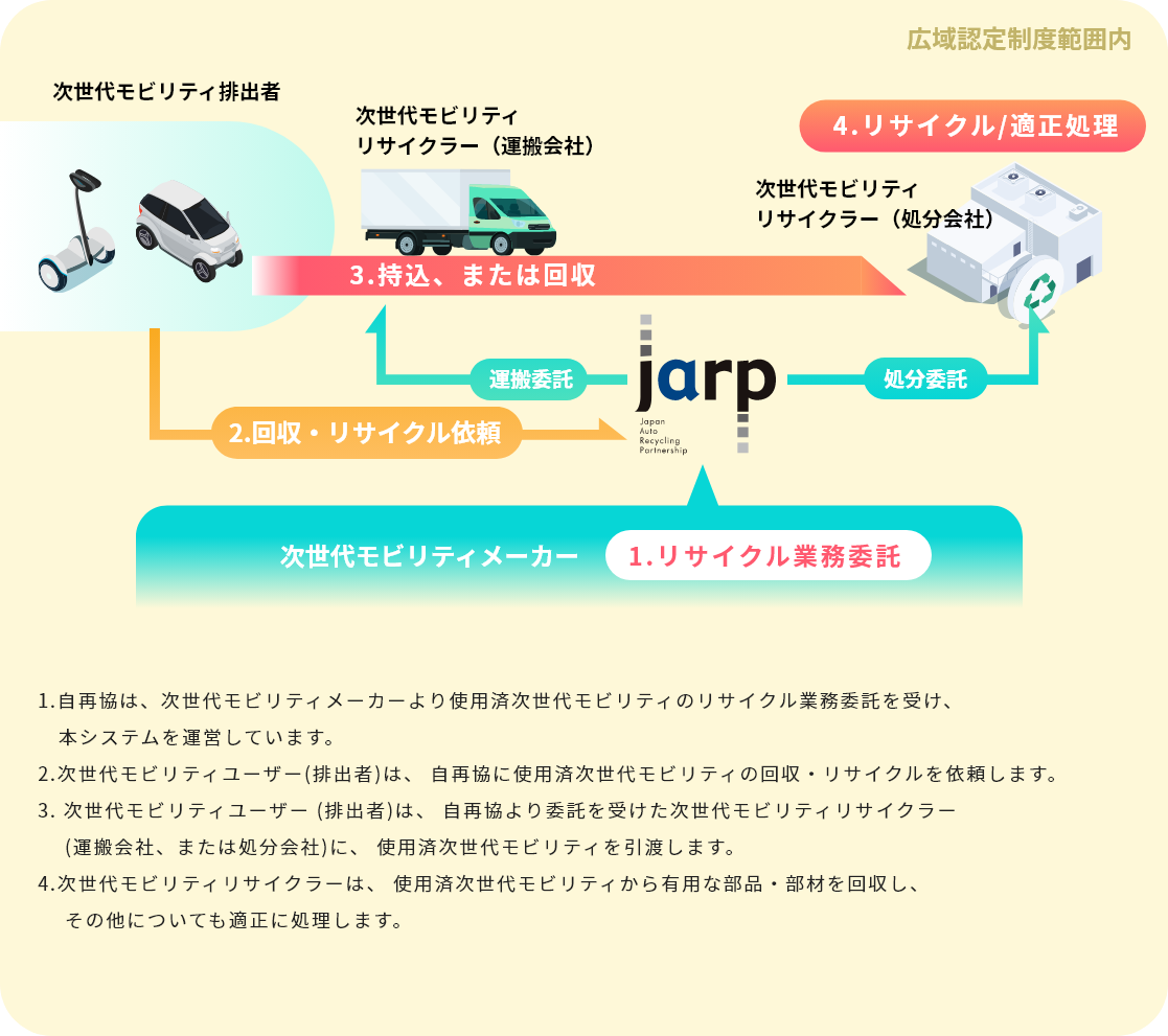 本システムは、今後の多様なモビリティ社会への移行を想定し、低コストで効率的な使用済次世代モビリティの回収・リサイクルが可能となるセーフティネットです。処理にあたっては、廃掃法の特例である「広域認定制度」を活用しております。 使用済みとなった際の各種環境問題の未然防止、適正処理促進へのご協力をよろしくお願いします。